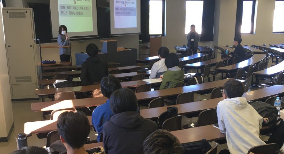 当日は、玉木保育学科長の挨拶のあと、基調講演として、文教大学(埼玉県)の及川智博先生による「子どもと大人が共主体であるための『構え』」が行われました。及川先生からの質問に挙手をしたり口頭で回答したりするなど緊張する場面が幾つもありましたが、それによってひとつずつ考察を深めながら“遊び”について専門的に理解することができました。