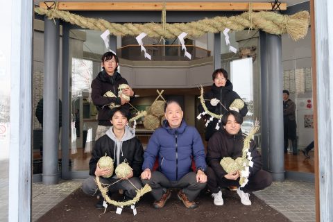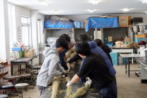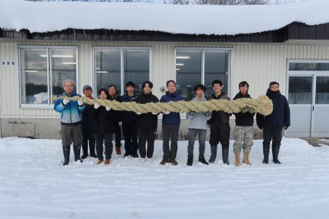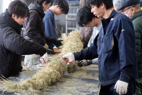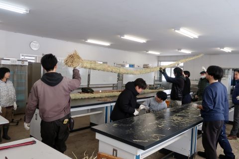 年末を迎えるにあたり、農学ビジネス学科の学生、国際学部 農業総合コースの学生および教職員が、本学恒例行事である大注連縄(おおしめなわ)の製作・設置を行いました。