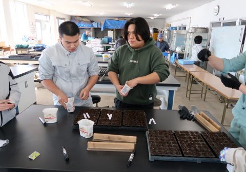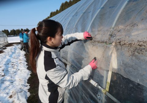 3月24日、農学ビジネス学科の新2年生が中心となり、水稲育苗用大型ハウスおよび野菜・花き用中型ハウスの展張作業を行いました。当日は天候にも恵まれ、作業は順調に進みました。