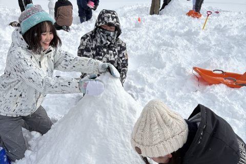 スノーフラッグやスノータッグでは目標物に向かって走り、雪にダイブすることを楽しみ、雪つみは静かながらもバケツやスコップなどを使ってどのチームが雪を高く積み上げられるかの勝負を楽しみました。終わった時には顔は良い感じに赤らみ、ほくほくとしてみな笑顔でした。靴下やズボンがべちょべちょになった学生はおりましたが…