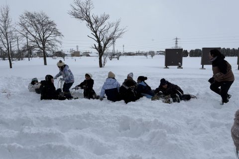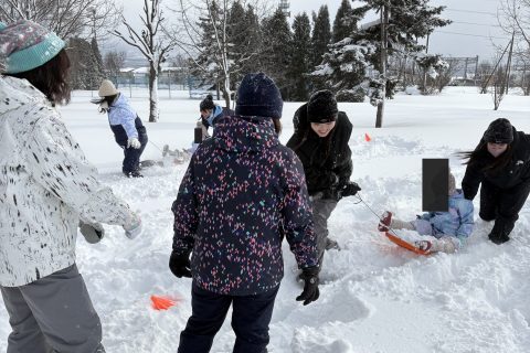 内容は、スノーフラッグやスノータッグ、ソリレー、雪合戦、雪つみなど40分ほど楽しみました。ふかふかの雪で走るだけでも大変で、足を取られて倒れこんだところに雪をばさばさかけたり、突然雪合戦が始まったり…終始きゃっきゃと皆無邪気に遊んでいました。