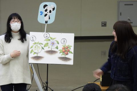 ・研究テーマを「こどもと食〜食の重要性〜」とし、研究内容を紹介したのちに体験型ペープサートを披露しました。