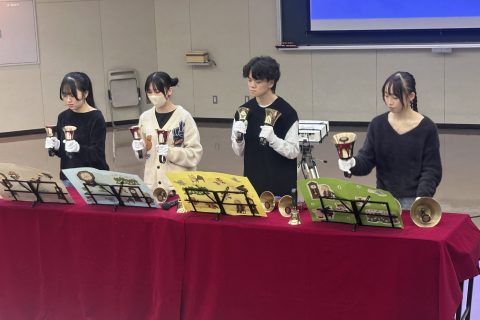 ・「子どもたちに音楽を届ける」ことを目標に活動し、市内外の園などで行った演奏などを、ハンドベルによる実演を交えて紹介しました。