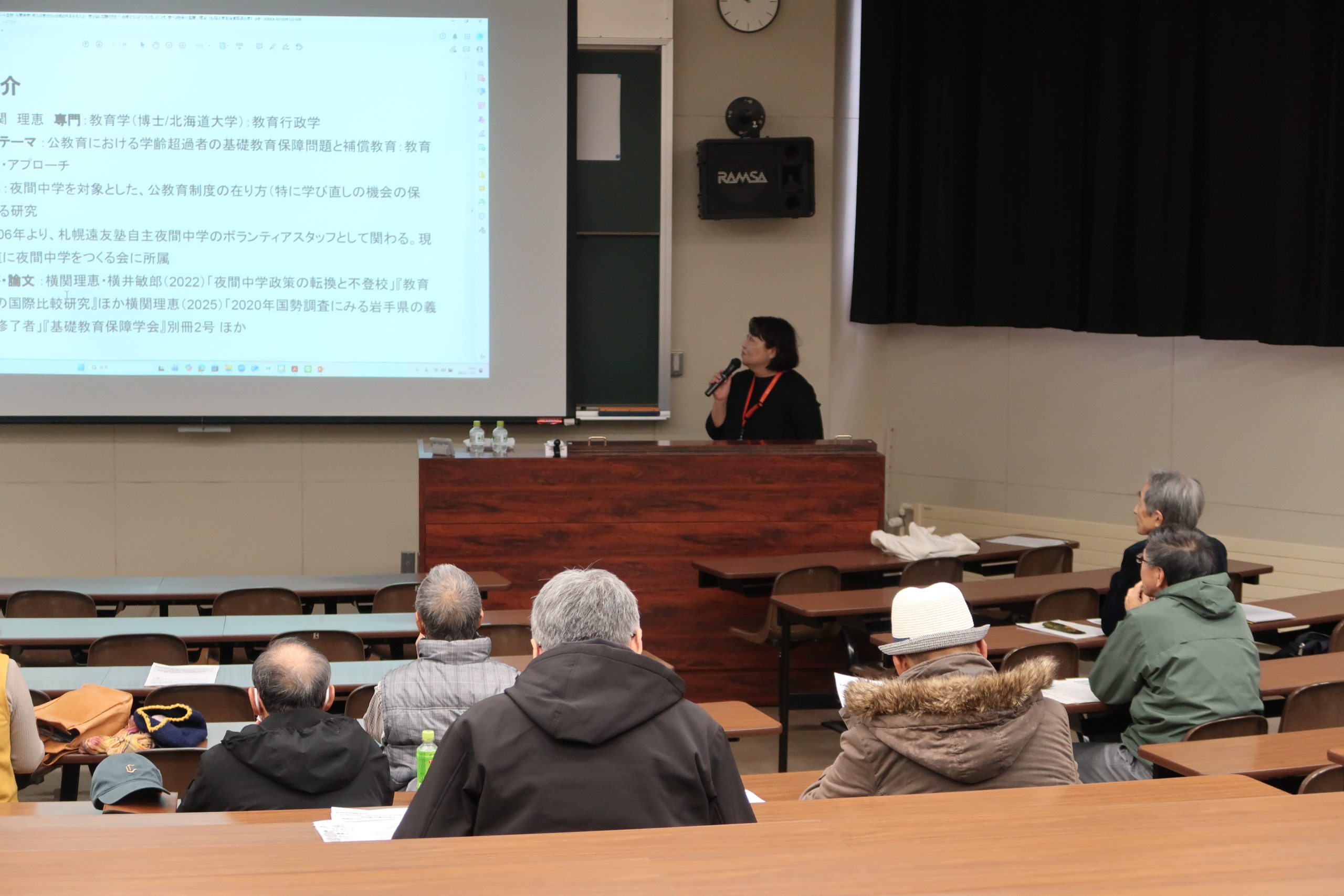 質疑応答では、北海道における義務教育未修了者の存在、映画『新渡戸の夢~学ぶことは生きることの証』予告を視聴した感想、市民でつくる自主夜間中学の役割に関する議論が活発に行われました。